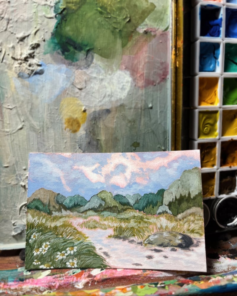 Painting is roughly 2.5"x3.5" in a 4"x6" vintage oak frame