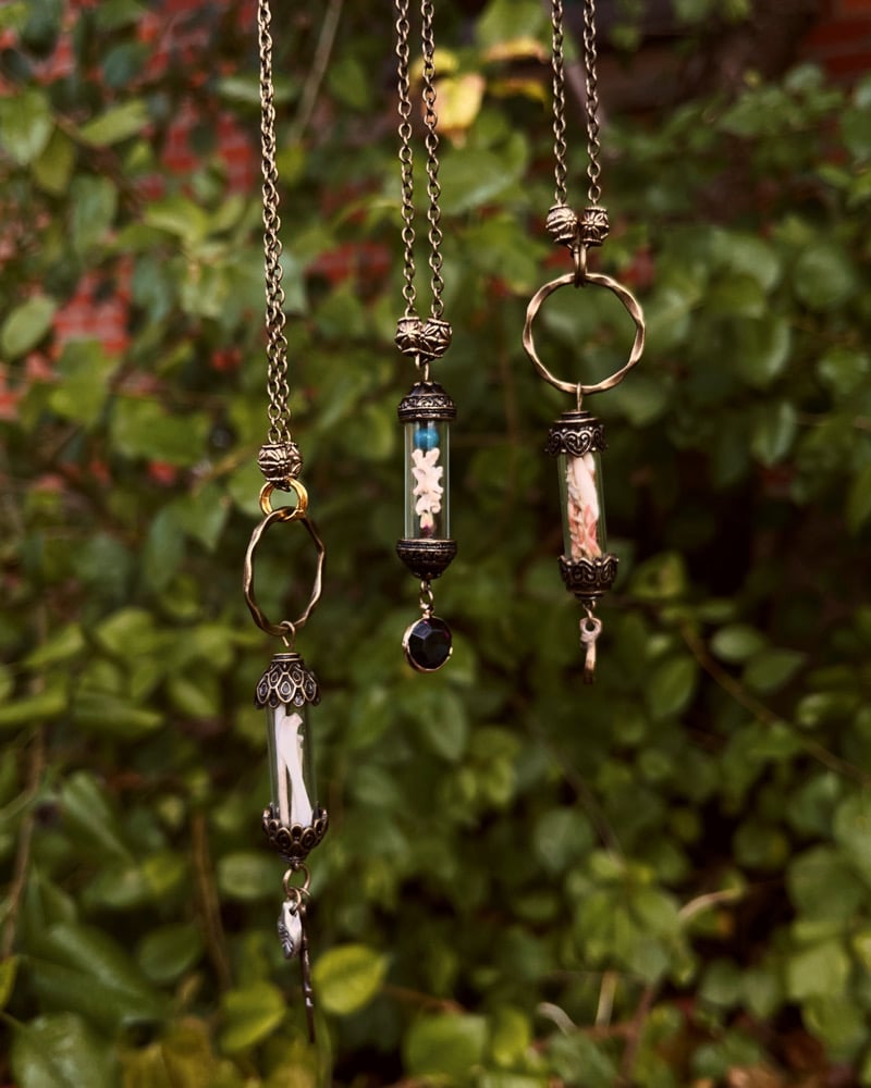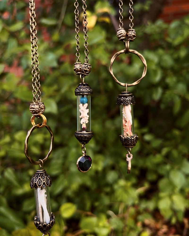 Each necklace is made with a small glass and metal tube terrarium